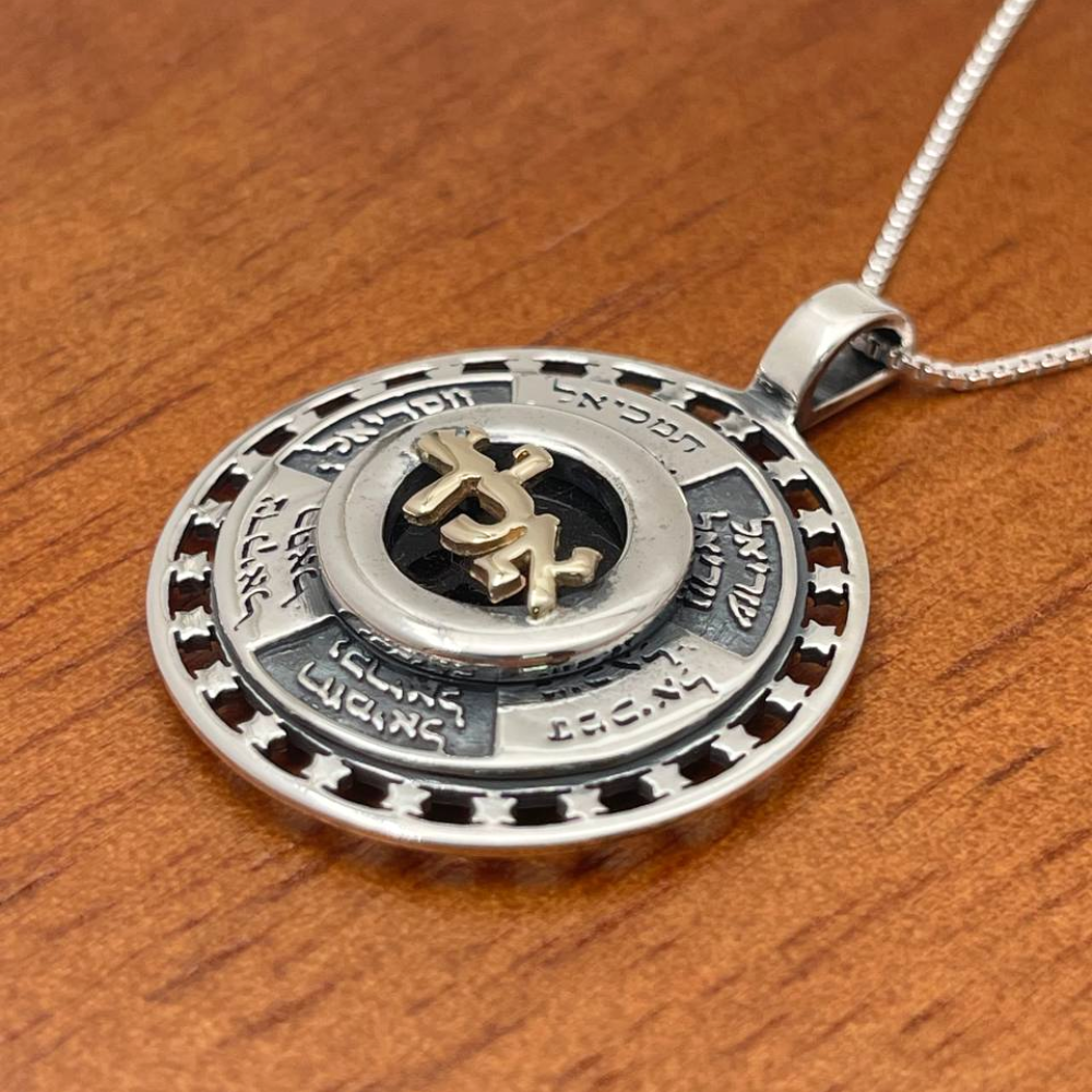 Surrounding this central inscription are the Hebrew names of twelve powerful angels, meticulously inscribed to invoke their unique blessings and protective energies. The entire medallion is framed by a beautifully detailed Star of David, a potent symbol of Jewish faith and safeguarding. The striking contrast between the silver and gold enhances the visual appeal and spiritual significance of this unique piece.