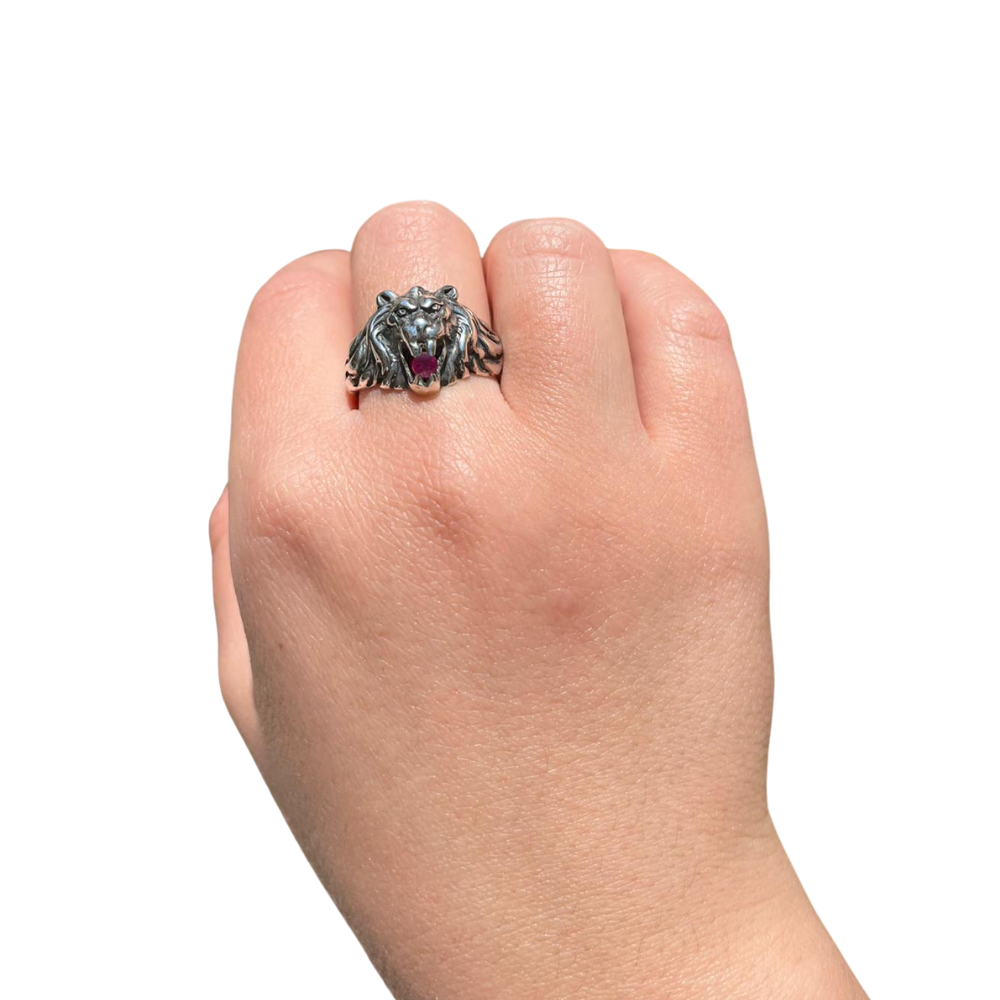The oxidized silver ring has the face of a lion emblazoned on it with it's glorious mane spreading and covering the ring's entire front. The oxidation within the deep grooves of the face and mane accentuate the ring's sharp detail. A grand ruby gleams radiantly in the lion's mouth, drawing the eye.