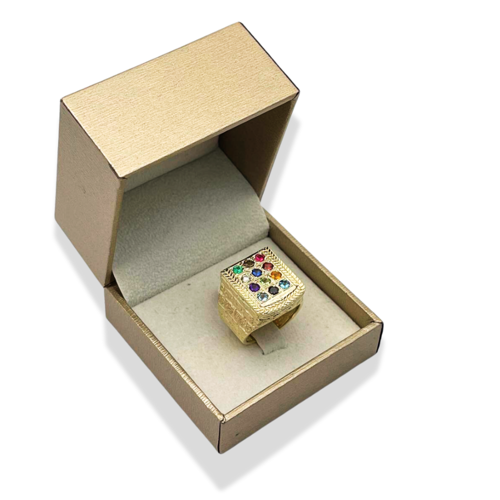 - The face of the ring is set with twelve precious and semi-precious stones, including a diamond