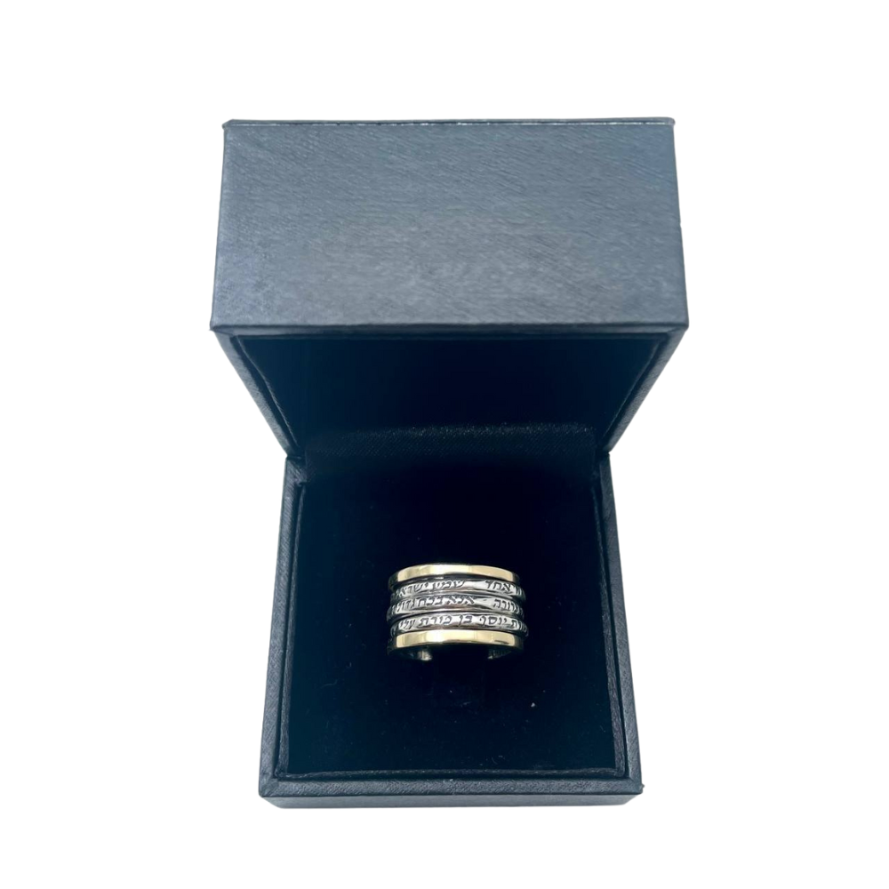 A wide Hebrew spinner ring featuring three separate spinner bands, each one engraved with a different Kabbalistic verse.