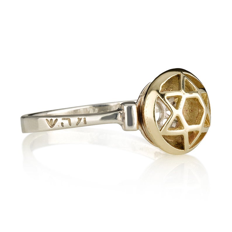 Creatively designed in line with Kabbalistic rubrics, this ring contains the Star of David outline in 14K gold. The ring band is in silver with 2 of the 72 names of God engraved on either side. On one side are the Hebrew letters: “Shin-Aleph-Hei” (for protection and happy married life) and on the other, are the letters “Mem-Hei-Shin” (for good health and spiritual strength).