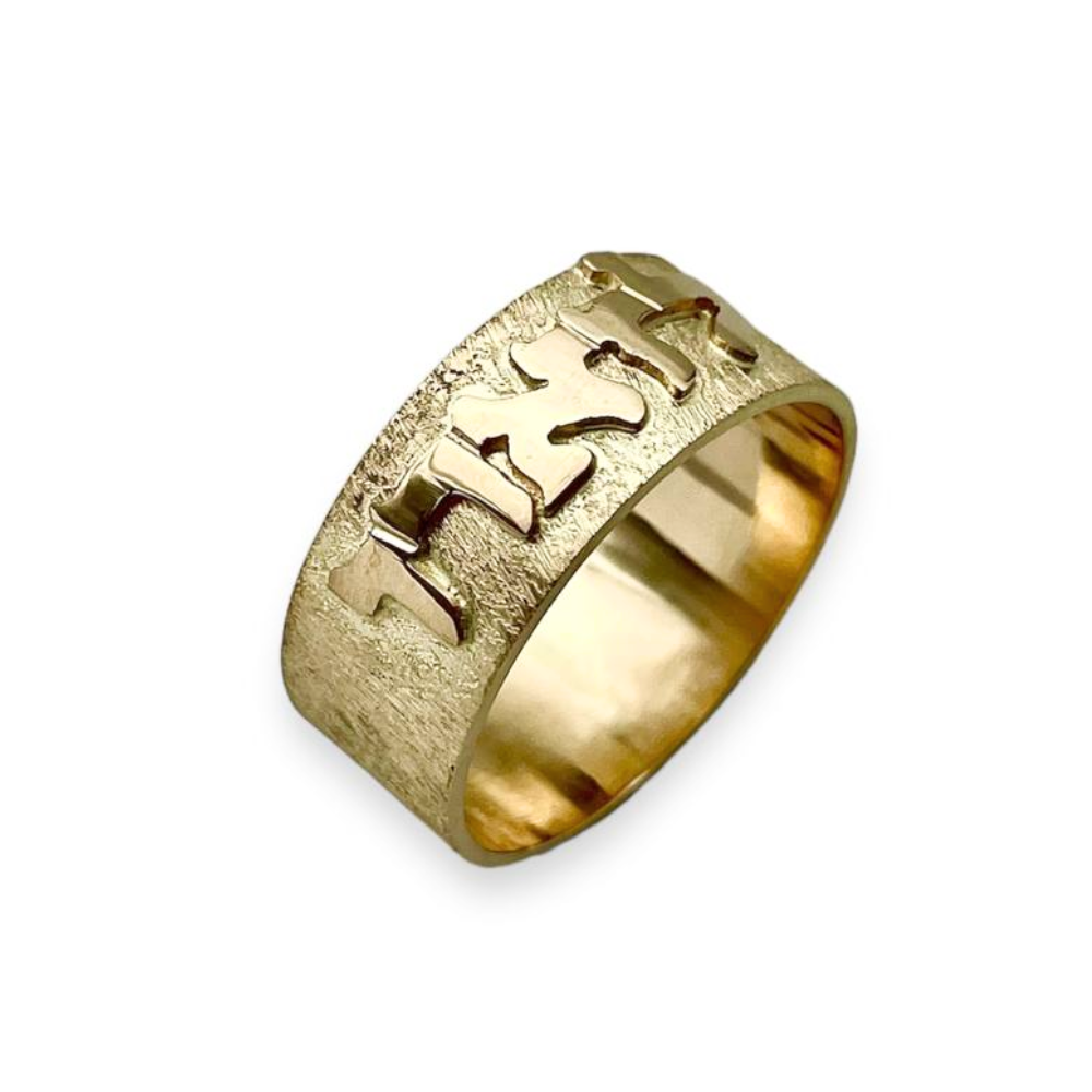 Perfect in its simplicity, this beautifully handcrafted 14k gold ring features raised polished gold letters on a delicate brushed gold finish. This lovely blend of textures causes the name to be prominently displayed in this monochrome gold ring.