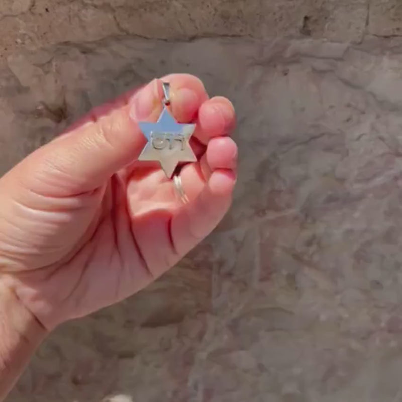 A classic beautiful silver and gold Star of David name pendant. This fantastic pendant is shaped like the ancient Jewish star, with a smooth silver surface and lovely raised gold letters spelling out your name. The combination of your name with such a meaningful symbol is extraordinary. In Judaism, the name tells a lot about the person and even has an effect on his life, which among other things is what makes name pendants such a meaningful gift.
