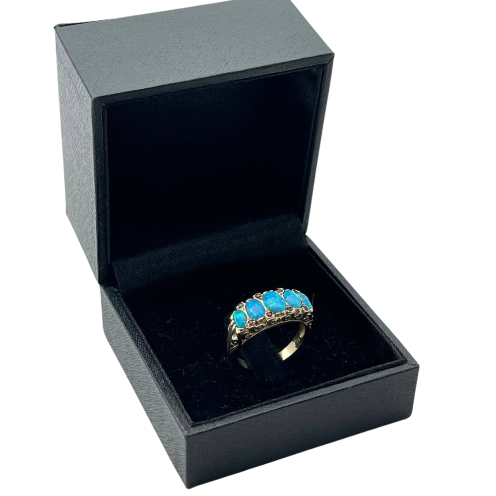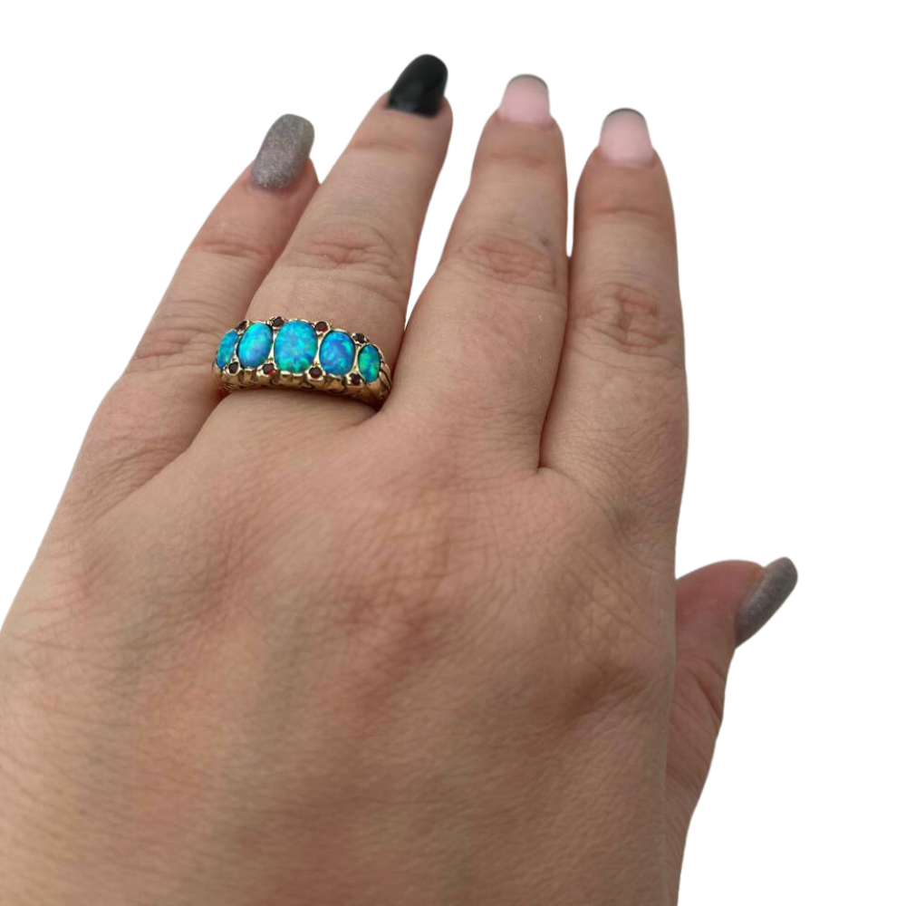 An ornately carved cocktail ring made of 14k yellow gold, set with dazzling blue opals and tiny red garnets.