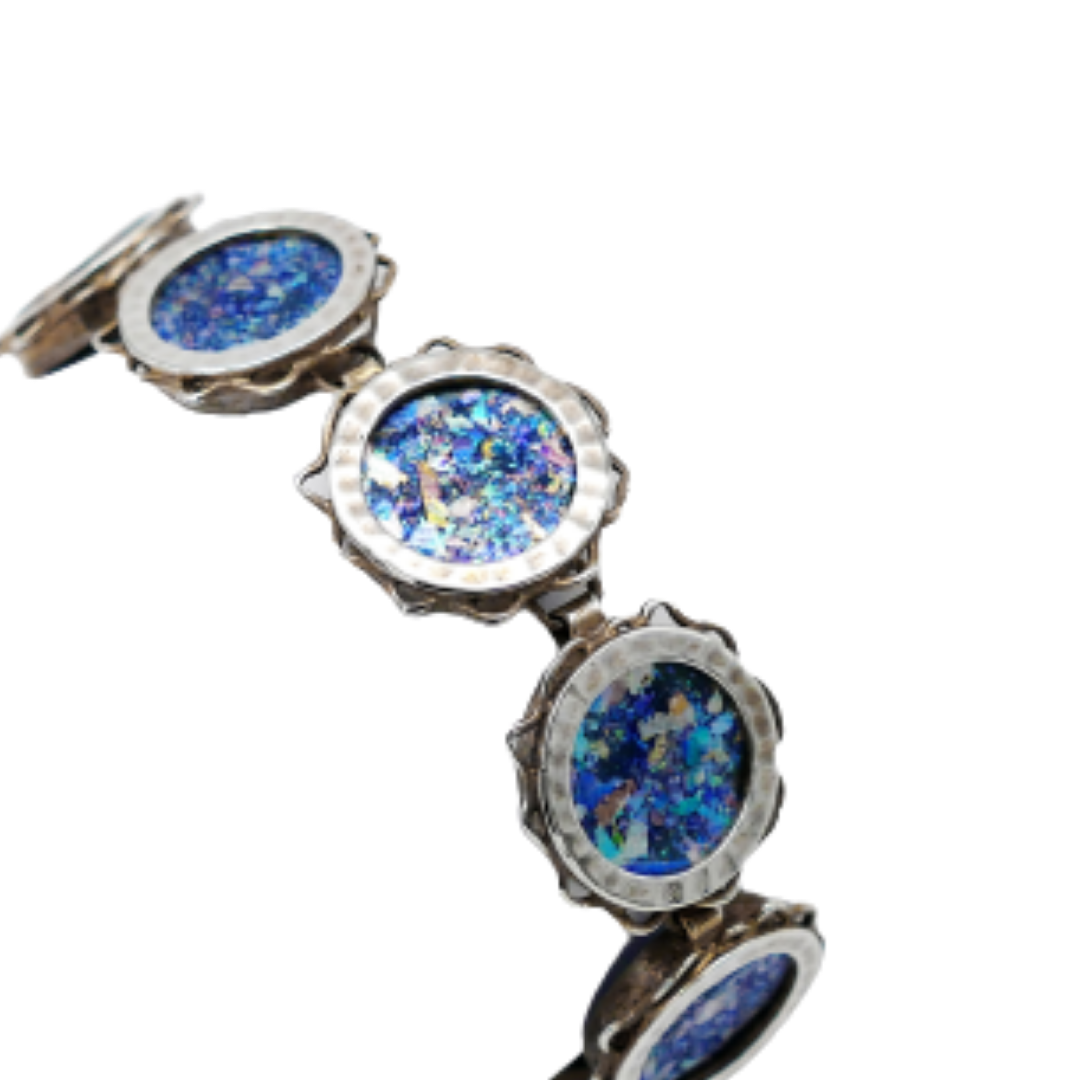 This silver bracelet speaks of the rich history of Israel. Handcrafted by Israeli artisans, authentic pieces of blue-green Roman glass excavated from Israel have been been framed in sun shaped frames in a symmetric continuous pattern. Roman glass, dating back over 2000 years, is known for it unique holographic blue-green patina.