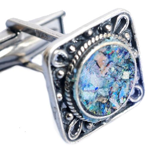 Handcrafted square sterling silver filigree cufflinks, set with sparkling 2000 year old Roman glass. This special glass is culled from archaeology sites in the Judean Desert, allowing the wearer to walk around with a piece of history on his wrists.