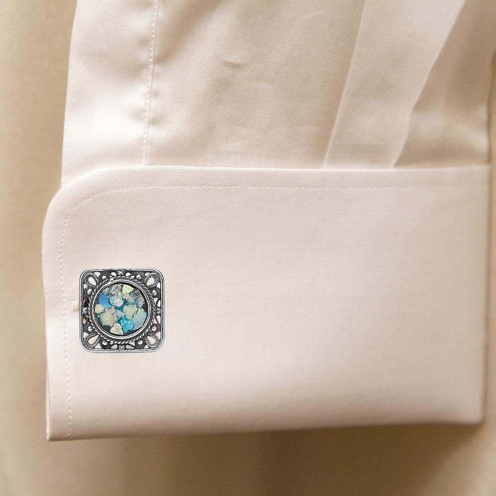 An eye-catching creation, this pair of silver cufflinks feature beautiful filigree work borders handcrafted by expert Yemenite artists. The silver square frame holds pieces of iridescent Roman glass, excavated from the Judean region. The Certificate of Authenticity for the Roman glass is available.