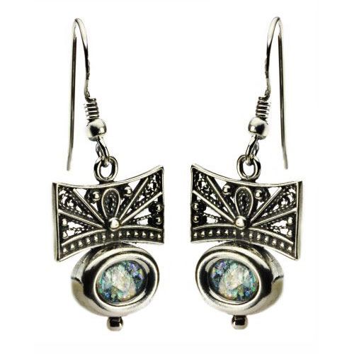 Adorable hanging earrings with sparkling Roman glass ovals embedded in a thick sterling silver casing. Ornate silver filigree sits on top like a decorative bow.
