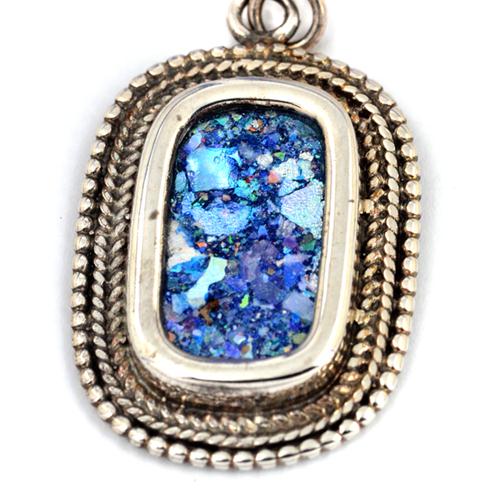 Iridescent deep blue Roman glass sparkles out from these gorgeous handmade earrings. A smooth sterling silver rectangle frames the glass while an elegant silver bead halo surrounds it, creating a classic and stylish look.