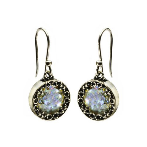 Like glistening stars in the night sky, the sparkling brilliance of the Roman glass in this earring set is perfectly contrasted by the oxidized sterling silver and filigree border, making a truly stunning set of earrings.