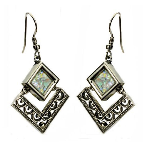 Sterling Silver Filigree Roman Glass Rhombus Earrings