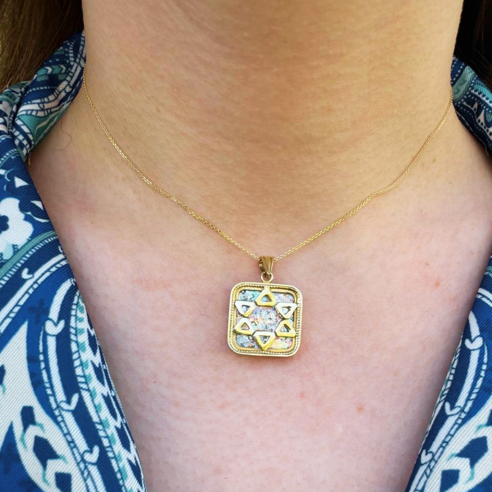 Displayed here is a 14k Gold Roman Glass Star of David Square Pendant, a unique work of art and a traditional piece of jewelry. The pendant is made of 14k yellow gold in a square shape with rounded corners and an inner border of small golden beads. In the center of the pendant, a square shaped shard of Roman glass is embedded. The brilliant hues of green and blue contrast the gold beautifully. But what truly makes this pendant special is the gold Star of David that sits atop the Roman glass.