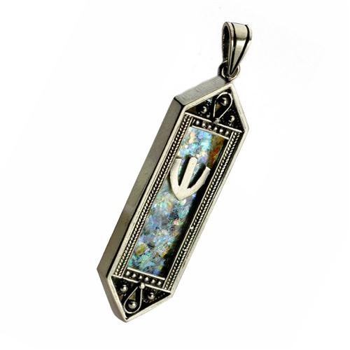 Handcrafted from sterling silver, this detailed mezuzah pendant has pointed ends adorned with oxidized beads and loops. The center of the mezuzah is filled with spectacular multicolored Roman glass. A shiny letter "shin" is soldered on near the top.