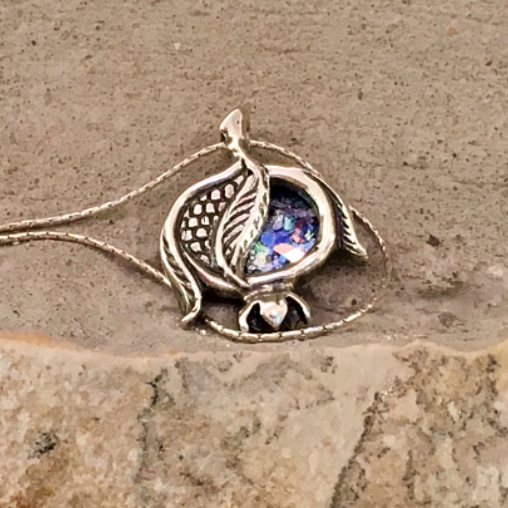 This gorgeous silver pomegranate pendant is set with genuine antique roman glass found in excavations in the Judea desert. This all-Israeli piece is a great gift for a loved one, and the perfect way to spoil yourself for the holidays.