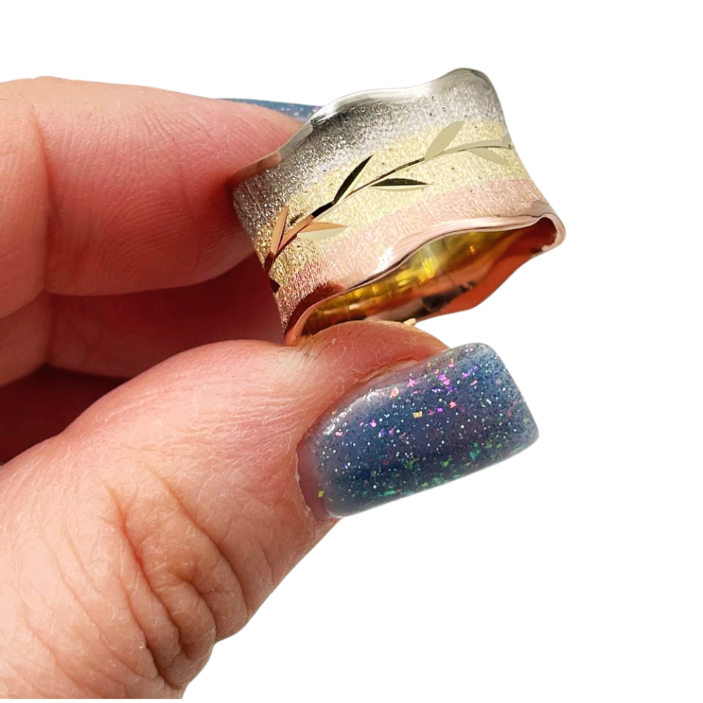 This stunning three tone 14k gold wedding ring has a wire brushed finish with smooth polished edges of a curvy shape. The ring is comprised of rose, yellow and white gold strips, with a lovely branch and delicate leaves decorating its center. This gorgeous ring is a perfect wedding band as it is decorated with a blooming branch, symbolizing life and growth.