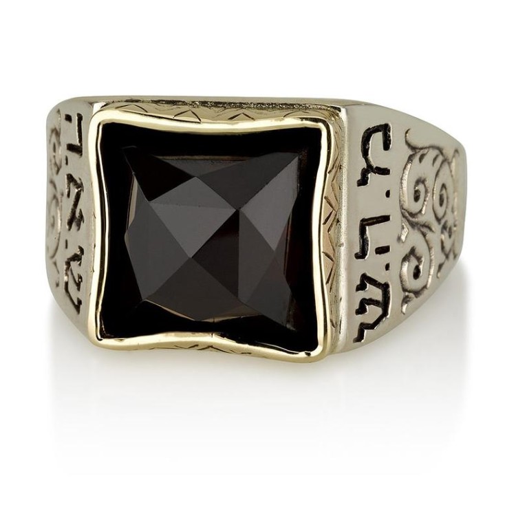 This gorgeous ring features a square Black Onyx stone set in 14K gold as its crown. The silver band is engraved with 2 of the 72 names of God in the Jewish faith. The engravings are the Hebrew letters: “Shin-Aleph-Hei” (for blessings of protection and marriage) and “Mem-Hei-Shin” (for blessings of health and strength) on the other.