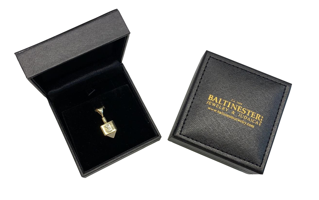 This dazzling 14K Gold Diamond Hannukah Dreidel Pendant, special from Israel by Ben Jewelers, will enhance your Hannukah celebrations immensely. The dreidel is made of solid white gold. All four of the traditional letters found on a Hannukah dreidel are embedded with diamonds. What makes this pendant even more unique is that since it is made in Israel, it has the Hebrew letter “peh” instead of the Hebrew letter “shin”, showing that the great miracle of Hannukah occurred “here” in the Holy Land of Israel. (Everywhere else in the world there is a “shin” which stands for “sham” – there, showing that the miracle happened there, in Israel.)
