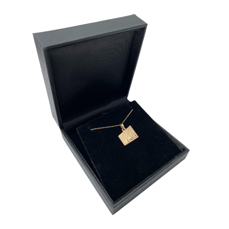 This lovely 14k Gold Kotel Name Small Pendant is a beautiful piece of jewelry and a great way to reconnect to Jerusalem. The pendant is made of solid yellow gold in a flat, rounded rectangle shape. Horizontal and vertical engraved lines form a depiction of the Kotel, or Western Wall, making it come alive. The Hebrew name of your choice is soldered on in polished gold letters. This piece makes a wonderful gifts for all occasions.