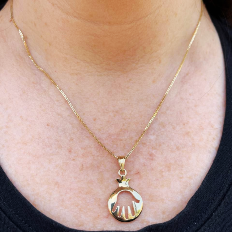 This 14k Gold Pomegranate Hamsa Pendant has a very unique design and is quite eye catching. The pendant, made by Ben Jewelers, is made of solid polished yellow gold in the shape of a pomegranate. Cut out in the center is a five-fingered hand, a modern take on the traditional Hamsa. The combination of the classic and trendy look of this pendant make it one of a kind.