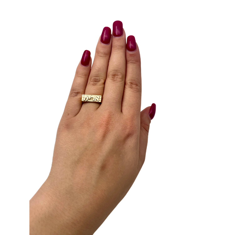 Have your name emblazoned on the bricks of the Kotel with this beautiful 14k gold ring. Handcrafted from 14k gold, this unisex ring features a squared front etched with bricks to resemble the holy Western Wall. Artistic Hebrew lettering is soldered on top in the name of your choice.