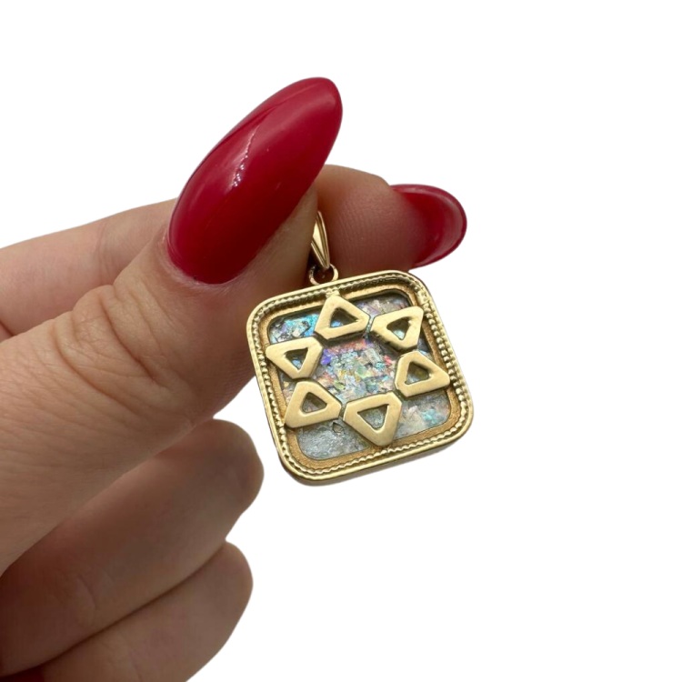 Displayed here is a 14k Gold Roman Glass Star of David Square Pendant, a unique work of art and a traditional piece of jewelry. The pendant is made of 14k yellow gold in a square shape with rounded corners and an inner border of small golden beads. In the center of the pendant, a square shaped shard of Roman glass is embedded. The brilliant hues of green and blue contrast the gold beautifully. But what truly makes this pendant special is the gold Star of David that sits atop the Roman glass.