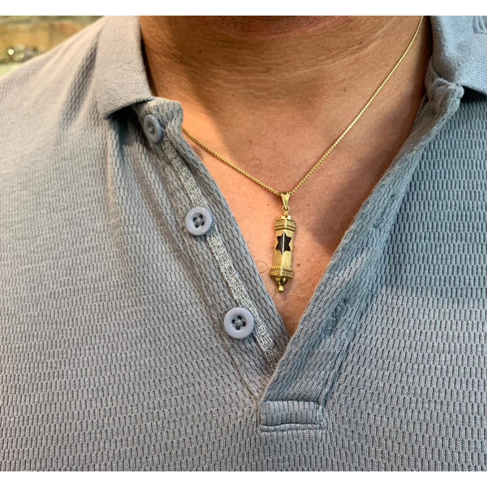 Intricately handcrafted 14k gold modern Mezuzah pendant. This very exceptional piece is designed as triangular shaped Mezuzah comprised of matte 14k yellow gold, with a white gold Star of David (Magen David) ”folded” over two sides. Both top and bottom of the pendant are surround by an etched frame decorated with the motif of the Western Wall. This is truly a collector’s item by Ben Jewelers.