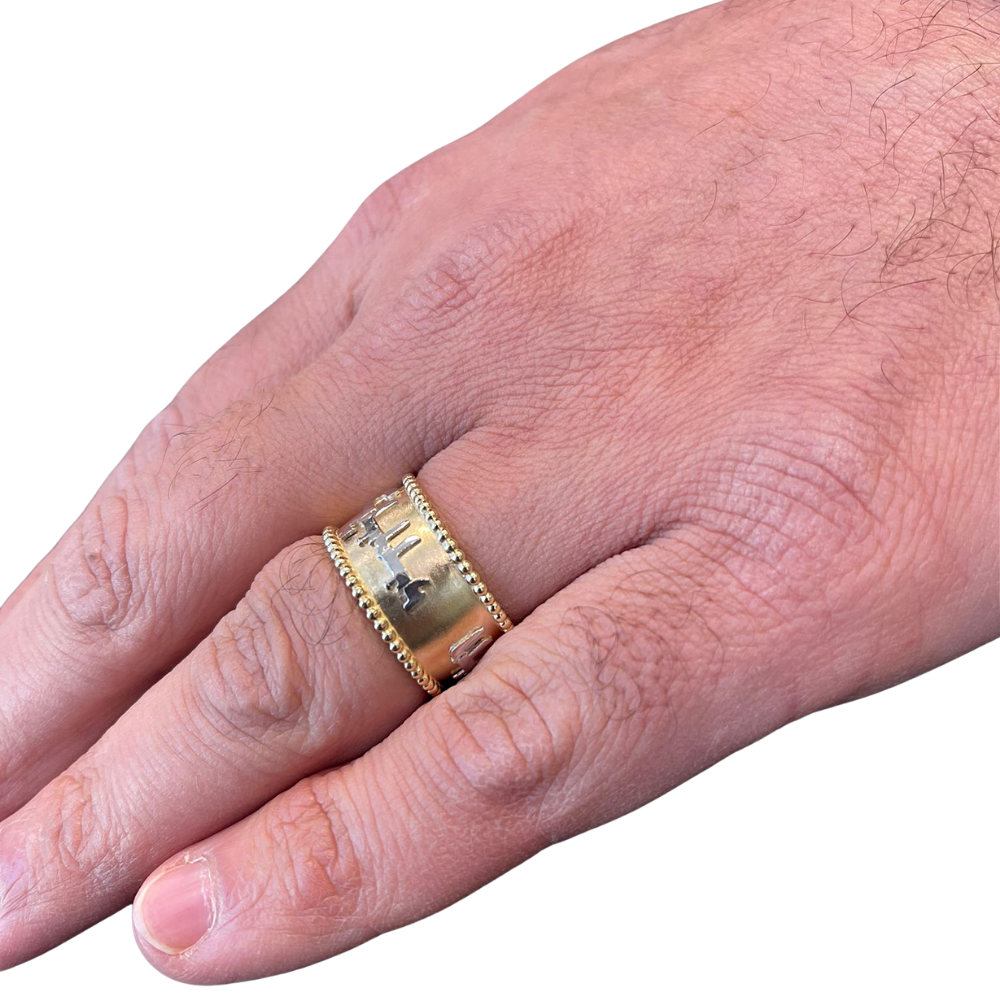 What a wonderful way to enhance your wedding day and the rest of your life. The ring is made of solid yellow gold with a matte finish. A border of shiny gold beads is at the top and the bottom, creating a charming style. Along the middle, the verse “Ani L’dodi V’dodi Li” (I am my beloved’s and my beloved is mine) or other inscription of your choice is soldered on in polished white gold. The words are written using sta”m letters, which are the special lettering used to write a torah scroll.