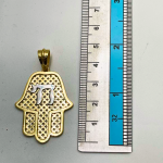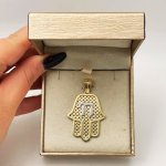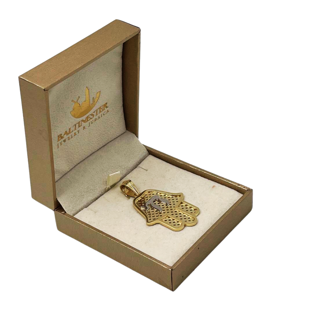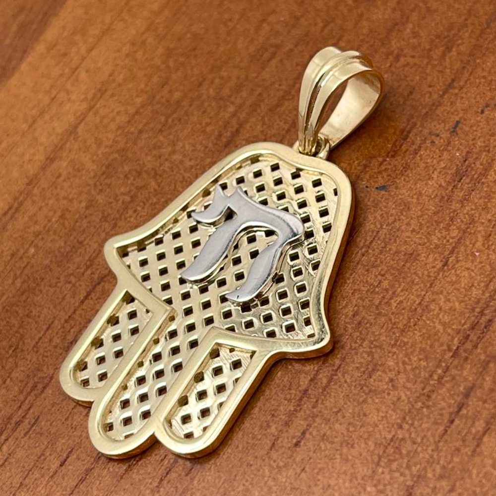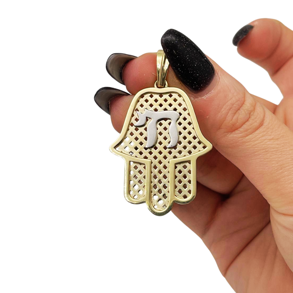 This 14K two-tone gold Hamsa & Chai pendant features a beautifully detailed yellow-gold Hamsa framed with a delicate white-gold mesh design, with a meaningful Chai symbol at its center. The combination of textures, tones, and spiritual elements creates a piece that feels both modern and deeply rooted in tradition.