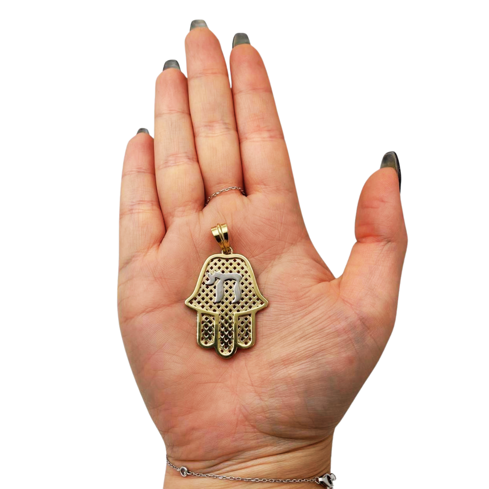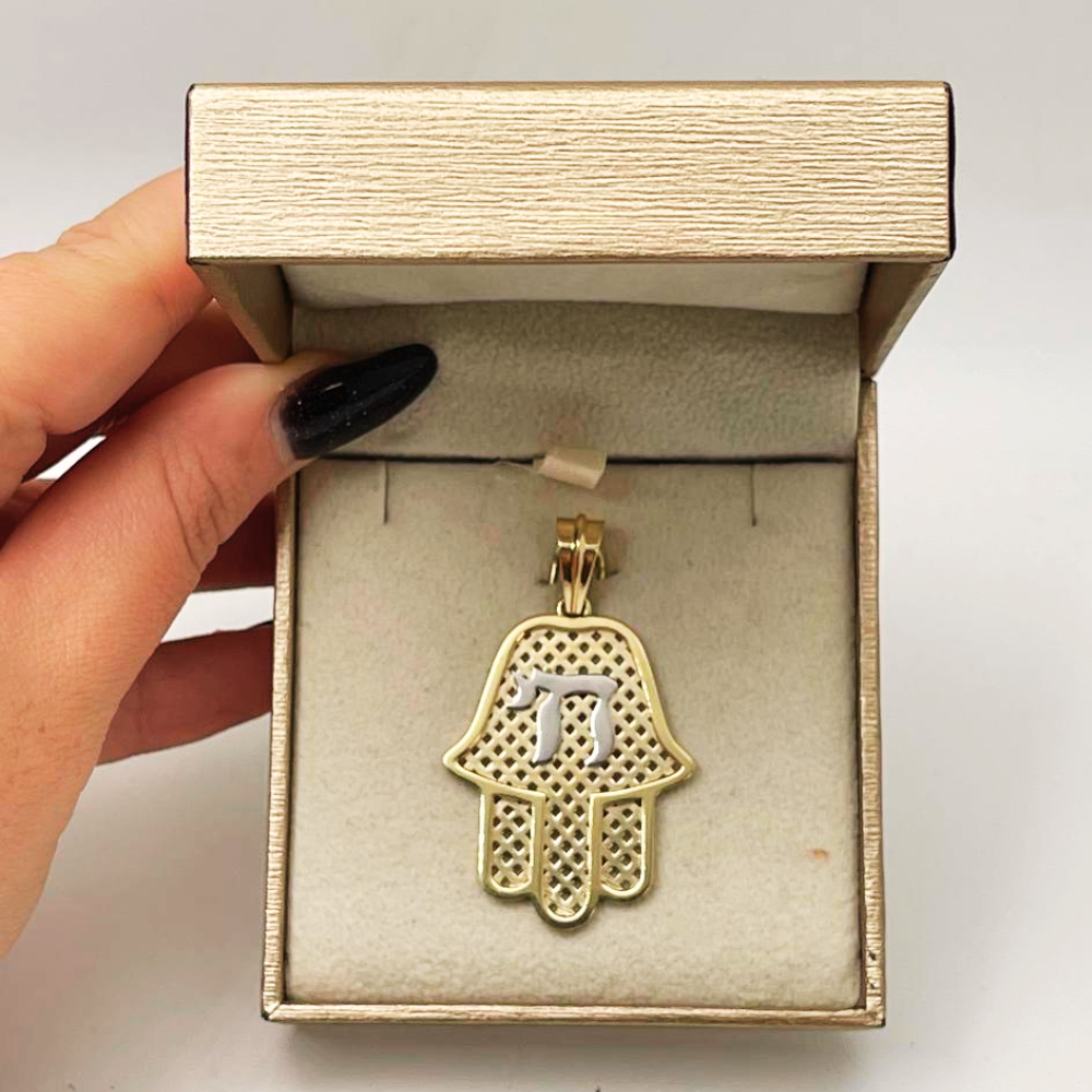 Handcrafted in Israel by skilled artisans, this large statement pendant offers presence without overwhelming—perfect for daily wear or as a treasured heirloom. The Hamsa protects, the Chai brings life and blessing, and the two-tone gold makes it effortlessly match any chain.