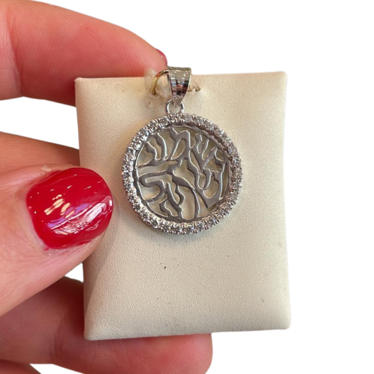A round pendant made of 14k white gold with a diamond studded border. The words “Shema Yisrael” are cutout in the center with a brushed finish.