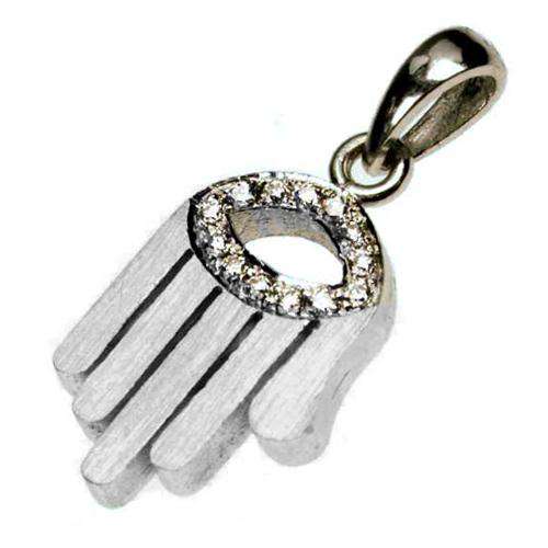 Contemporary design Hamsa pendant with a smooth satin finish. Cutout in the palm is an “Evil Eye” bordered by dazzling diamonds in a pave setting.