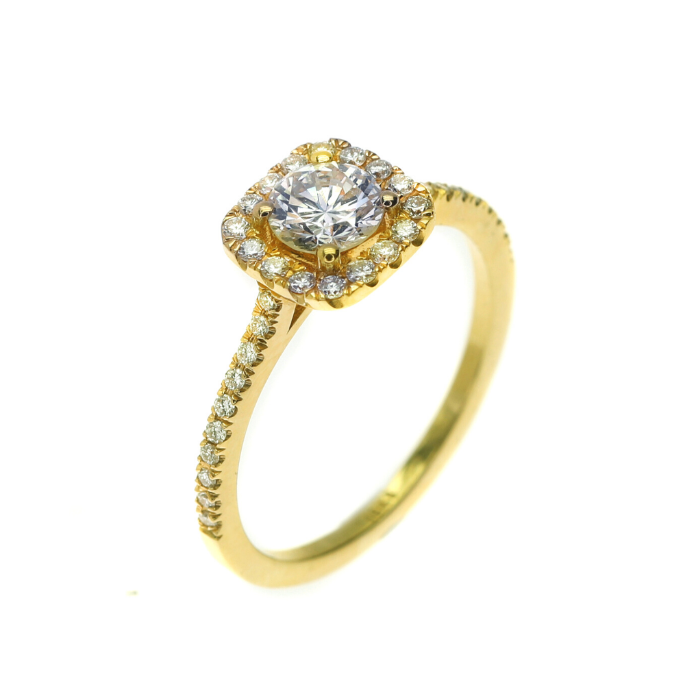 This charming ring features a central round sparkling diamond framed in a stunning square diamond halo.