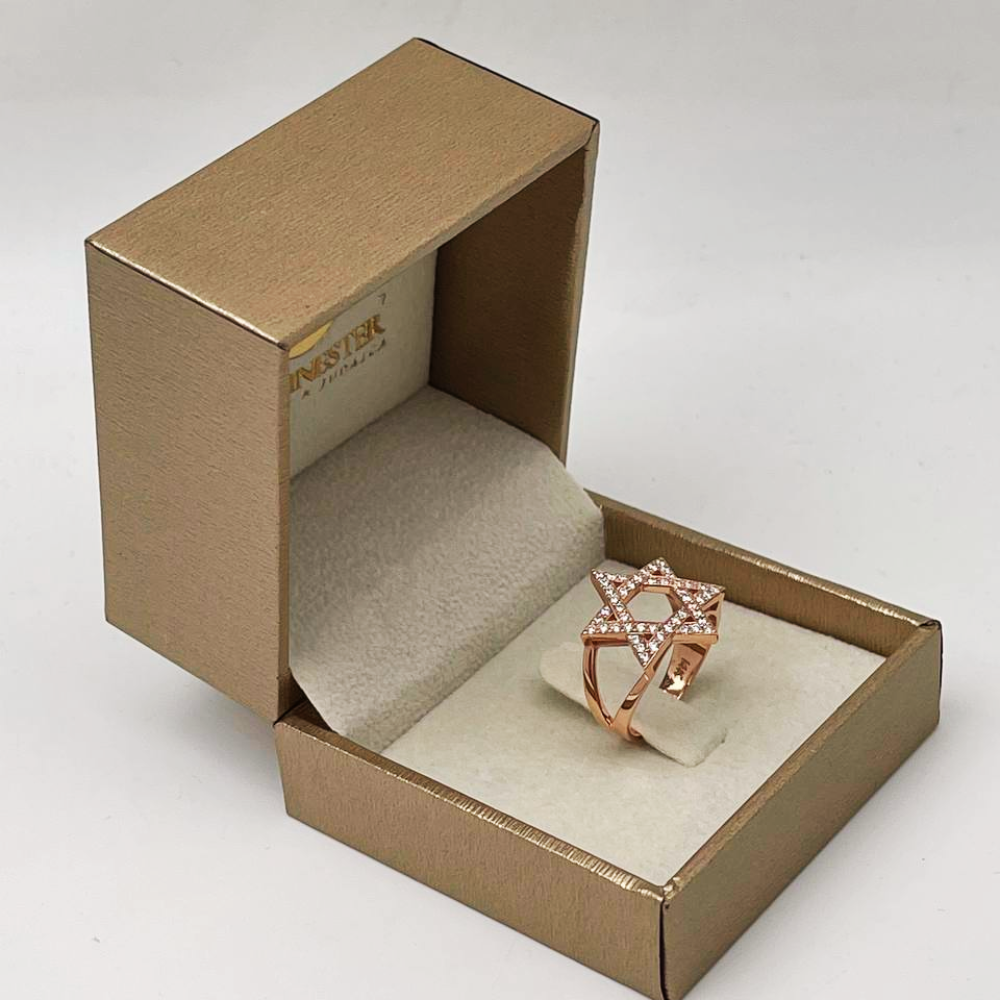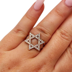 A luxuriously elegant creation, this Star of David Ring has been handcrafted in 14K gold and set with carefully selected diamonds in a single row pattern.