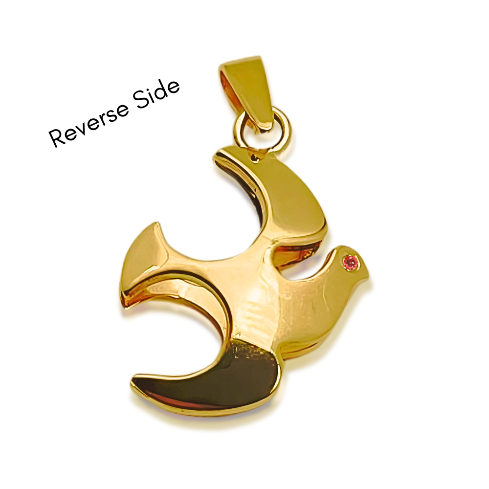 Discover the captivating beauty of this 14K gold dove of peace pendant, a symbol of hope and tranquility. Handcrafted in Israel with meticulous attention to detail, this 3D pendant features a sparkling diamond on one eye and a vibrant ruby on the other, creating a mesmerizing interplay of colors and textures. This elegant and meaningful piece of jewelry is perfect for any occasion and makes a truly special gift.