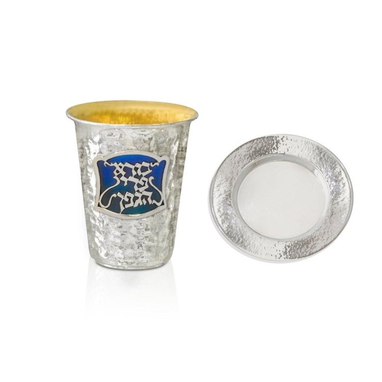 For people who love simplicity, this wonderful and simple Kiddush cup is a perfect choice. Its unique hammered finish combined with colorful enamel makes this a true must-have.
