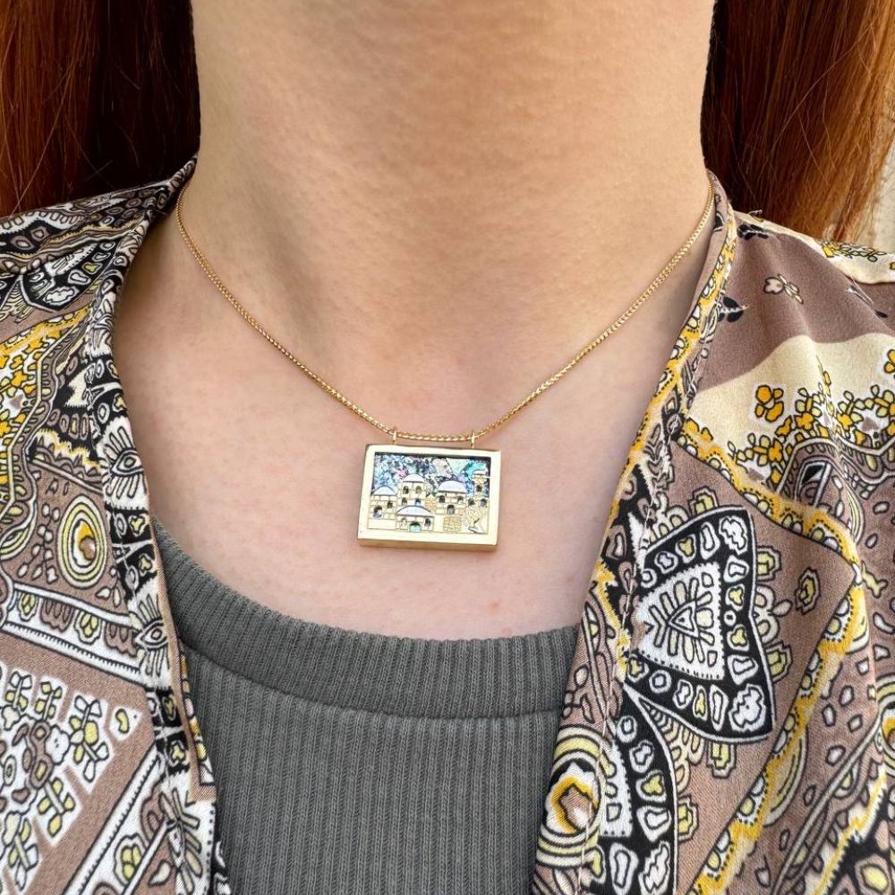This stunning 14K gold necklace captures the essence of Jerusalem against a mesmerizing backdrop of authentic Roman glass. Each piece of the 2,000-year-old glass boasts a unique color story, whispering tales from a bygone era. The intricate Jerusalem skyline etched onto the gold pendant adds a touch of tradition and personal connection to the Holy Land. More than just an ornament, this necklace becomes a conversation starter, carrying the weight of history unearthed from archaeological digs.