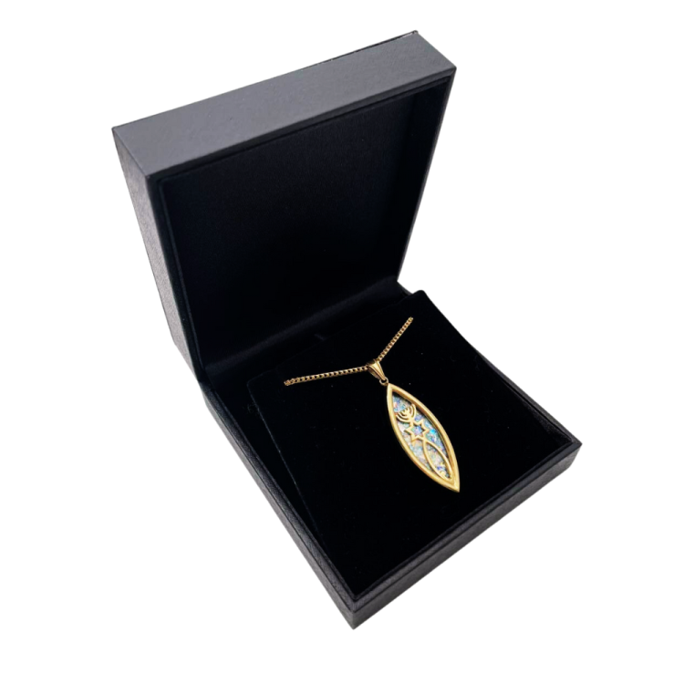 A harmonious union of metal and glass, this lens-shaped pendant is handmade from 14k gold and genuine Roman Glass. The gold encases the opal-like glass, along with three symbols of a menorah, Star of David, and fish. Seeped with meaning, these insignias are a treasure to anyone who understands the symbolism of the carved design. This symbol is known as the Messianic Seal of Jerusalem.