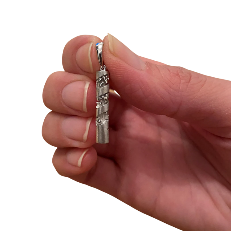 This stunning pendant handcrafted 14K gold is a designer blend of important Jewish symbols. The shape of the pendant is that of a Mezuzah. Through the length of the pendant are the words “Shema Israel” masterfully crafted in the Hebrew script.