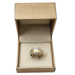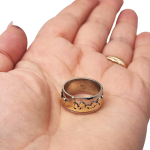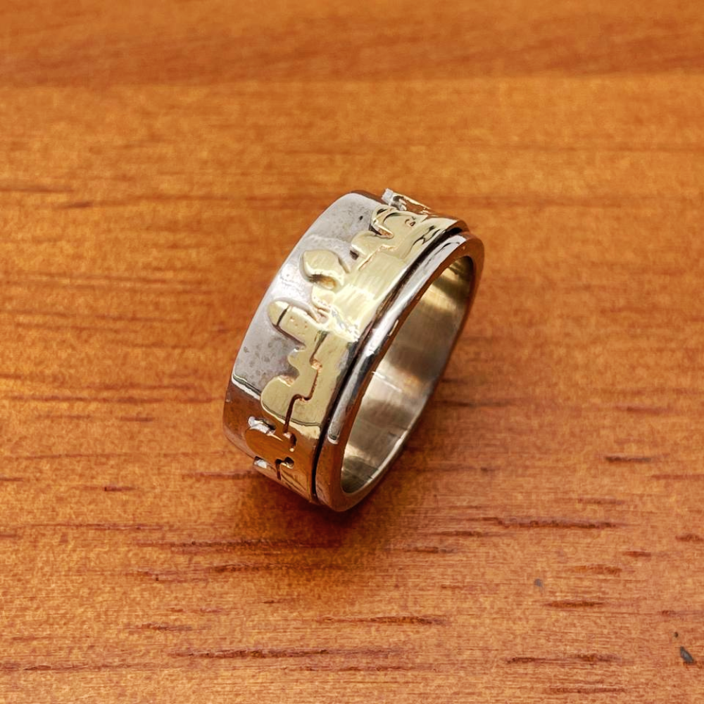 A classic ring made of sterling silver with a soft satin finish. A beautiful design of the Jerusalem skyline is soldered on in 14k yellow gold around the base of the ring.