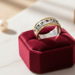 This is a unique and very special ring that is a great way to start off your life together with your loved one. The ring is made of a sterling silver base, with the words “Ani L’dodi” (or another inscription of your choice) engraved in oxidized letters. To add glimmer and style, four ruby stones are embedded in between the words. At the top and bottom of the ring, there is a 14k yellow gold band with a polished finish. The combination of colors and textures is simply outstanding.