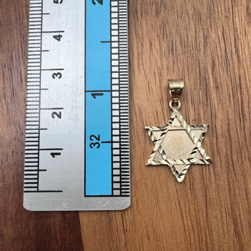 The Star of David, a powerful symbol of Jewish identity and spirituality, is beautifully rendered in brushed 14K gold. The brushed texture provides a modern, sophisticated look, while the diamond-cut borders add a touch of brilliance and sparkle.