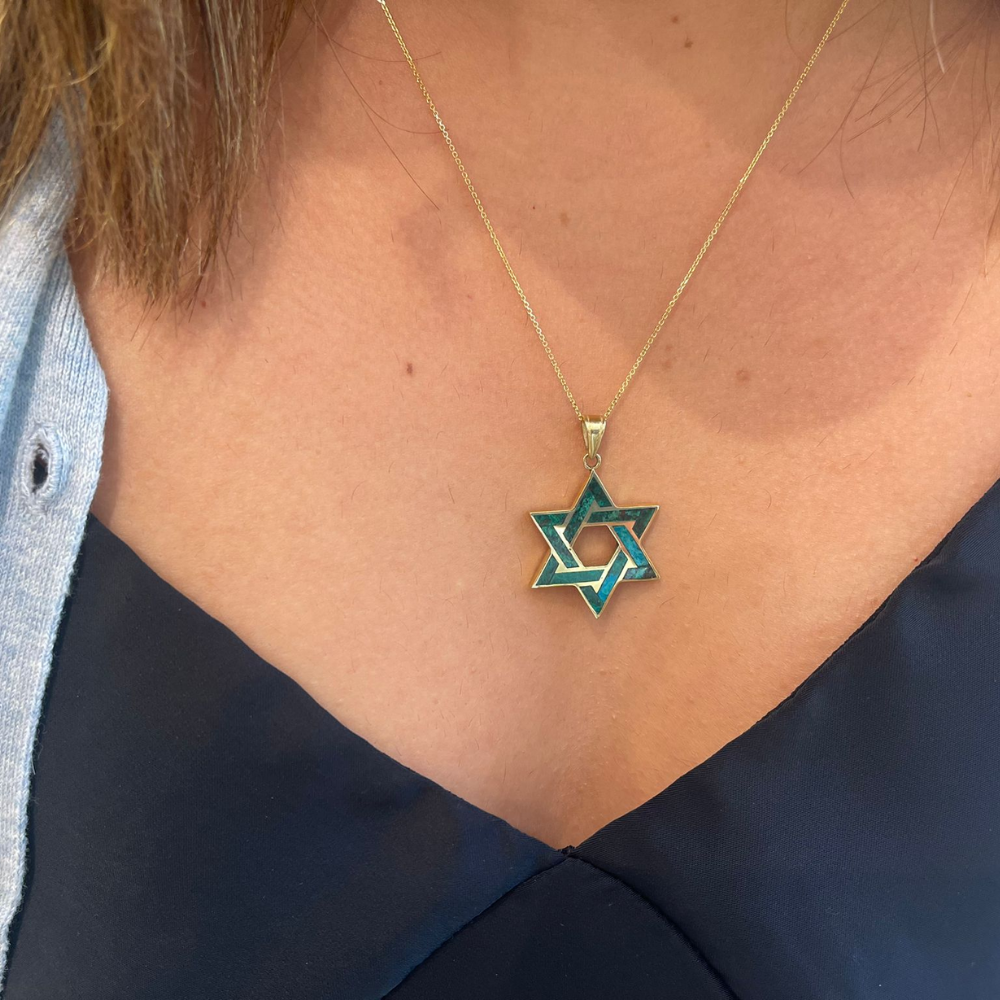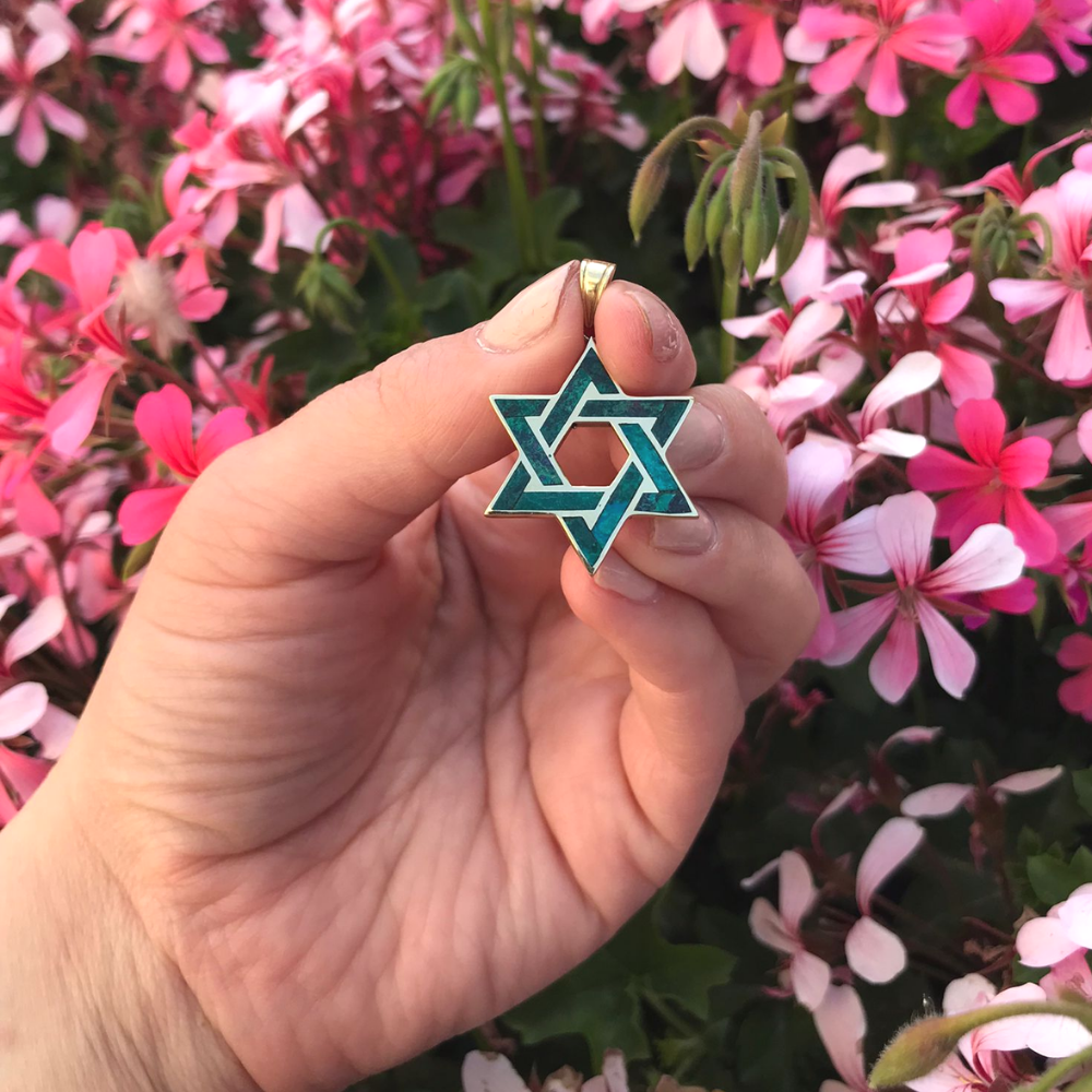 A stunning creation, this pendant is shaped to form a modern Star of David. The inside is set with the gorgeous green Eilat stone, native to the land of Israel.