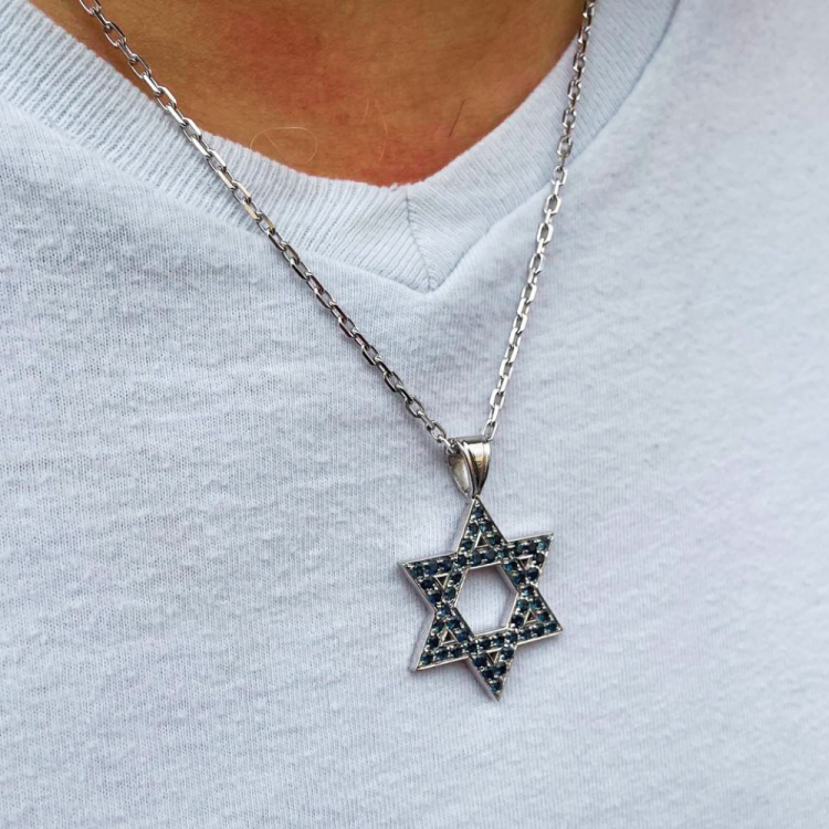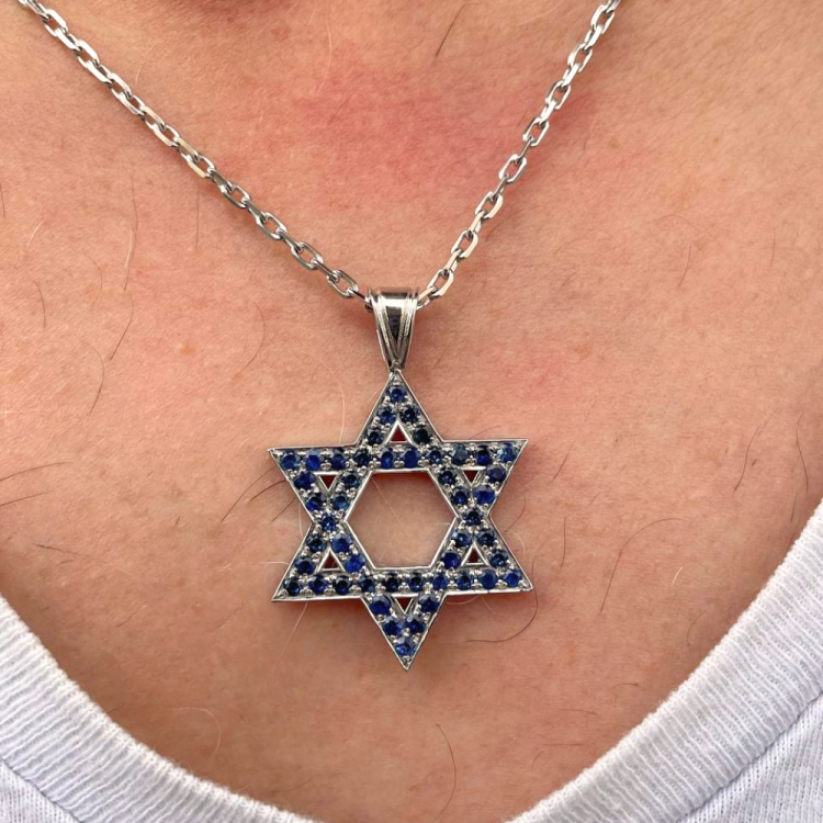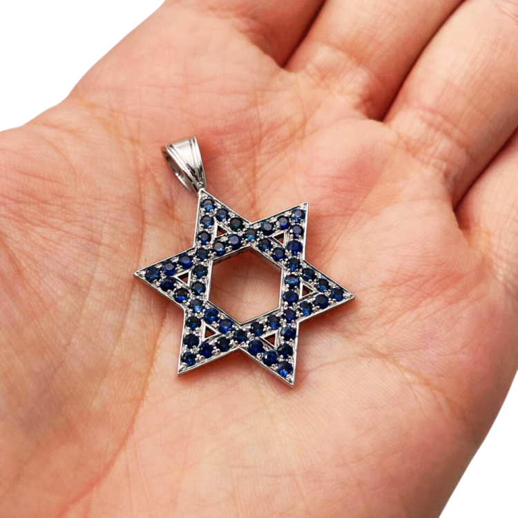 This large Star of David pendant is a testament to both tradition and luxury, making it a standout accessory for any occasion. The rich blue hues of the sapphires add a touch of sophistication, enhancing the overall allure of this meaningful piece.