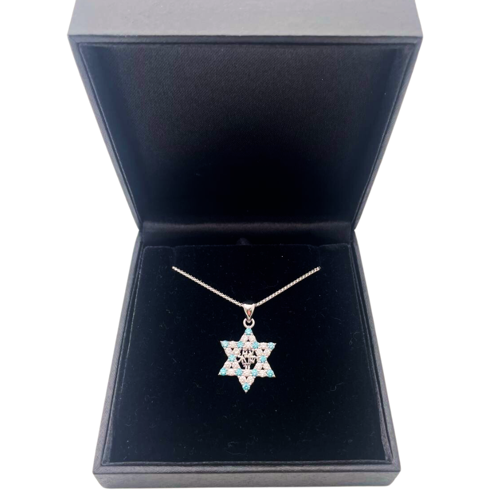 Illuminated by dazzling blue and white diamonds, this pendant is a testament to Jewish heritage and strength
