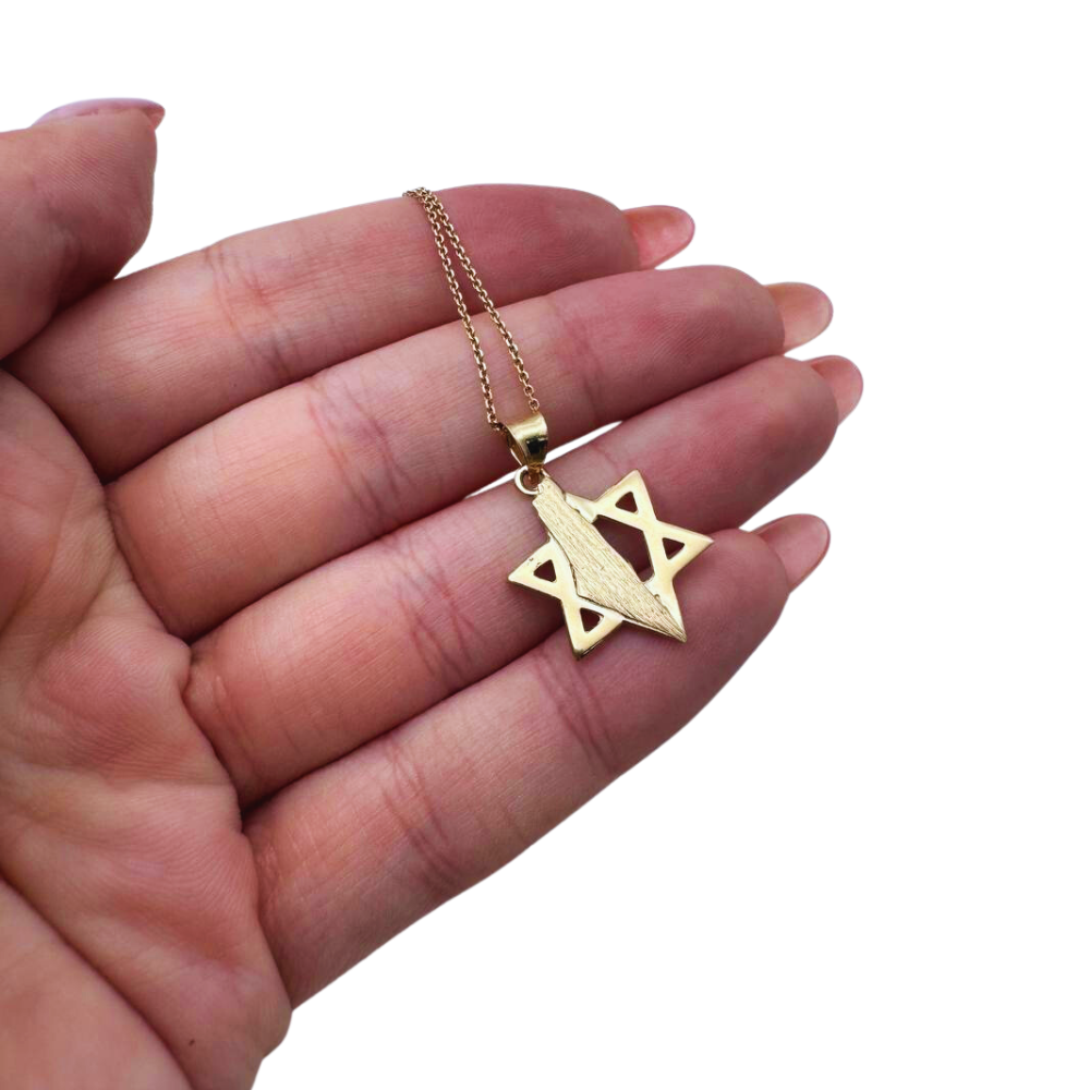 This exquisite Star of David with Map Pendant, handcrafted in 14K gold by skilled Israeli artisans, is a powerful statement of faith and solidarity. The magen David, a cherished symbol of Judaism for centuries, is the prominently shape of the pendant. It represents the interconnectedness of God, creation, and humanity, reminding you of your place within the divine plan. Nestled within the Star of David lies the map of Israel, the Holy Land.