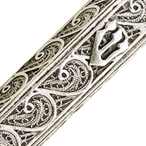 This beautiful Sterling Silver Filigree Style Mezuzah Case is a traditional piece of Judaica and makes a great housewarming gift. The mezuzah is made of sterling silver in a rounded shape, with intricate filigree artwork decorating the entire mezuzah. The Hebrew letter “shin”, standing for one of G-d’s names, is soldered on towards the top in shiny silver. The unique design makes this a wonderful addition to our Mezuzahs collection.