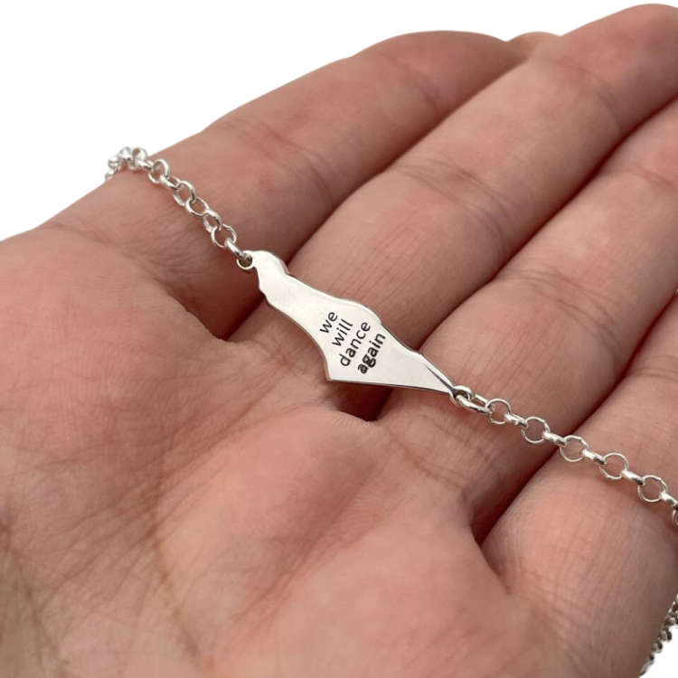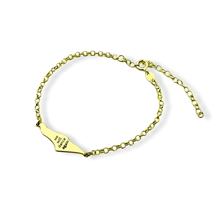Introducing the “We Will Dance Again” Bracelet in 14 gold, a meaningful piece inspired by Mia Schem’s incredible journey. Thoughtfully designed, the bracelet showcases an engraving of the powerful phrase “We will dance again,” set against the silhouette of the Map of Israel.
