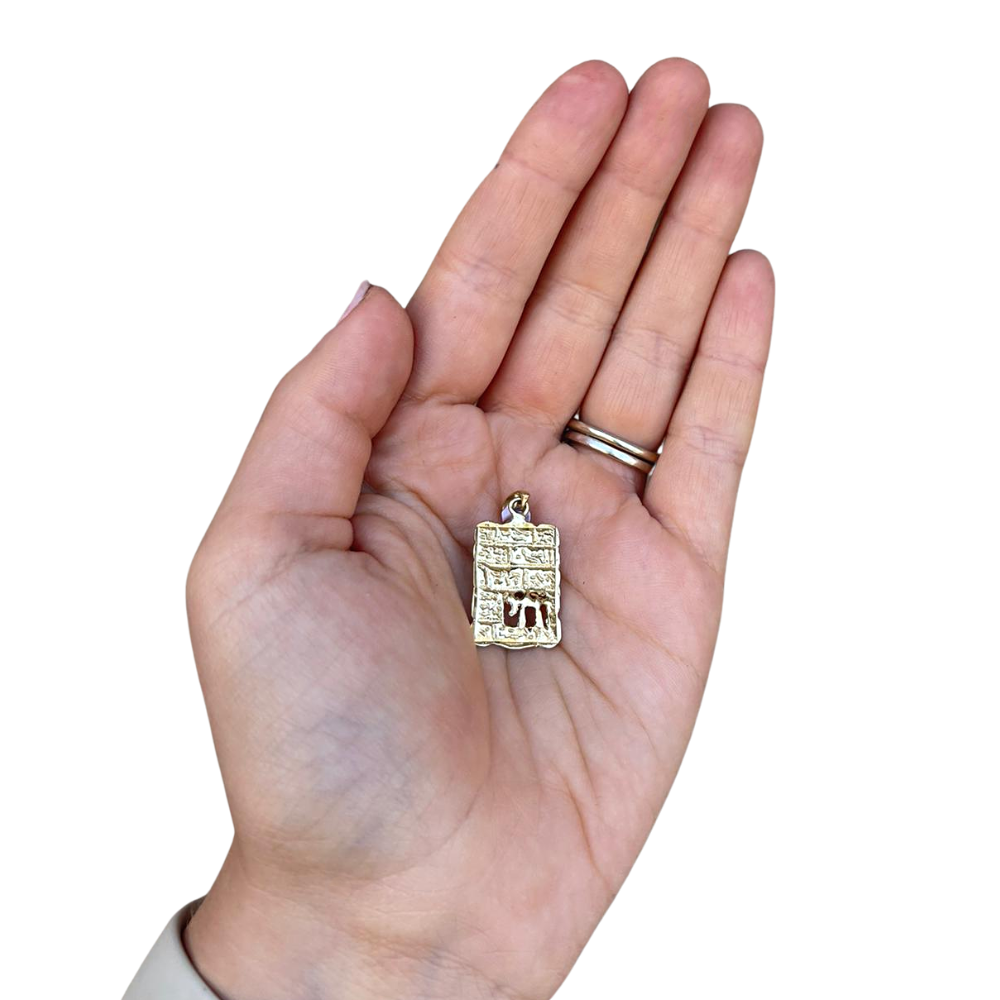 This is a pendant not only full of meaning but full of beauty as well. The design and craftsmanship executed to perfection making this 14k gold Kotel Chai Jerusalem pendant a one of a kind piece of jewelry.